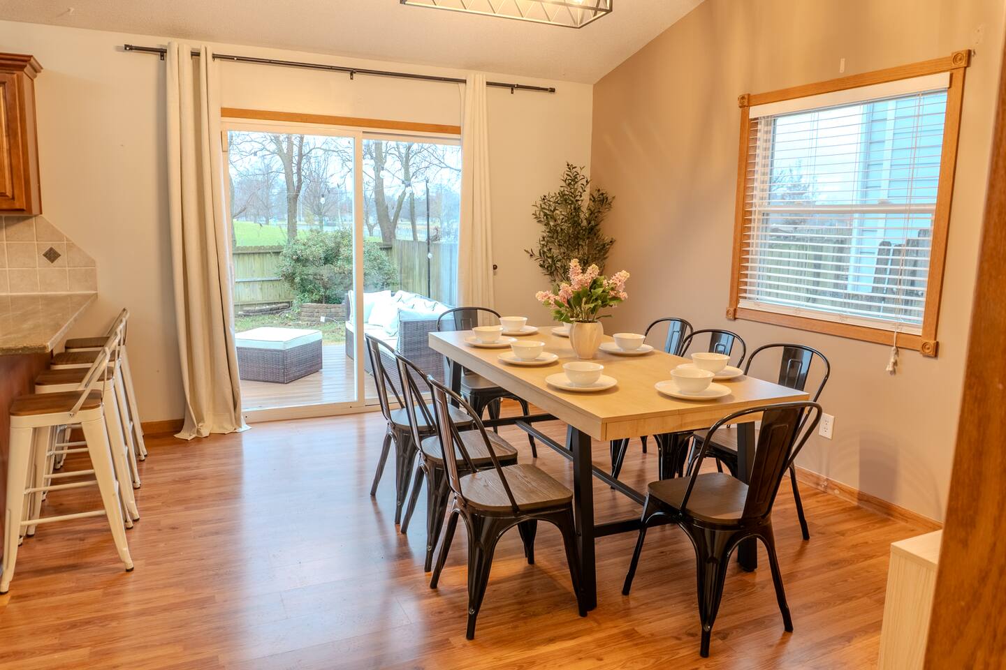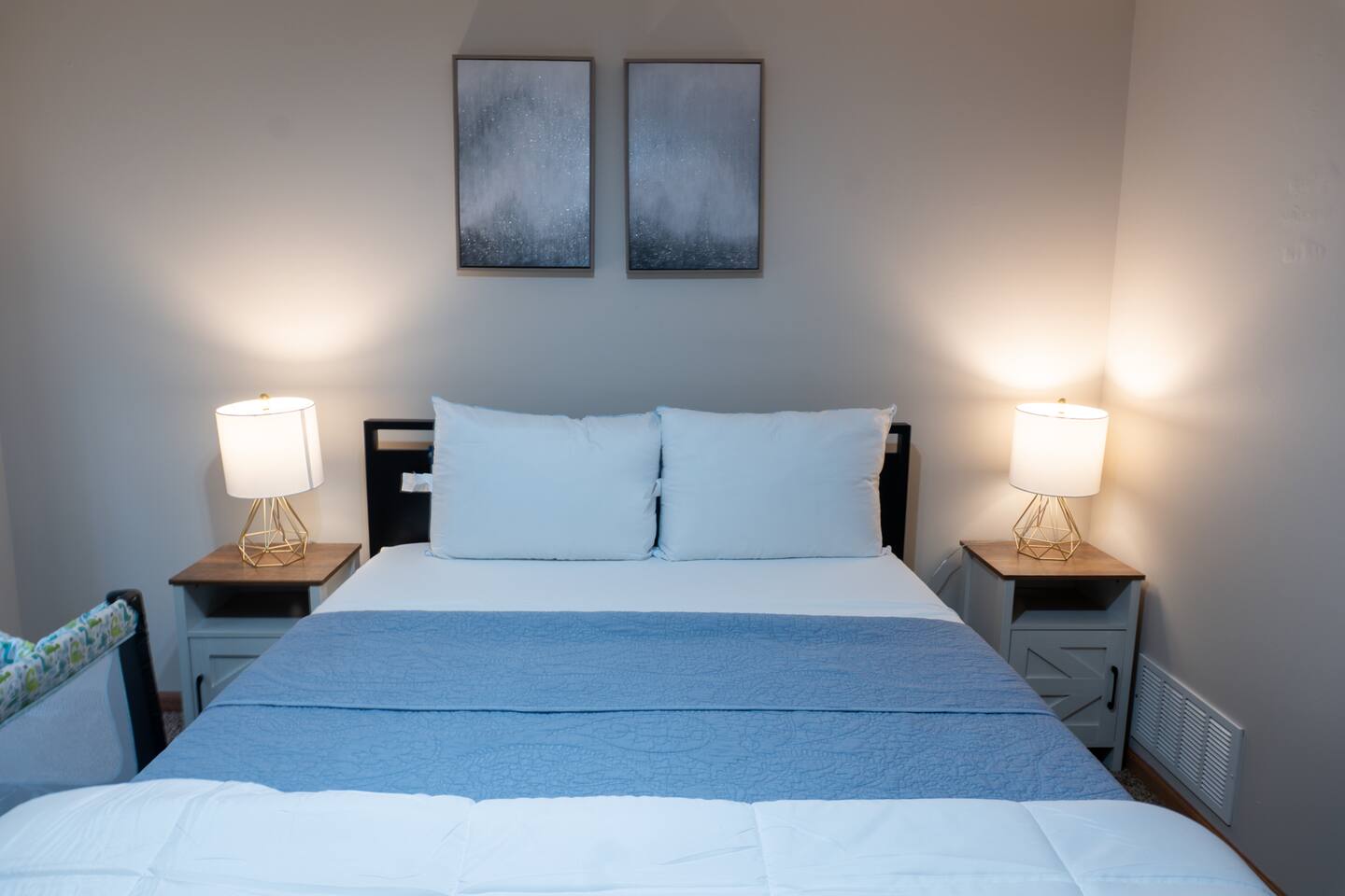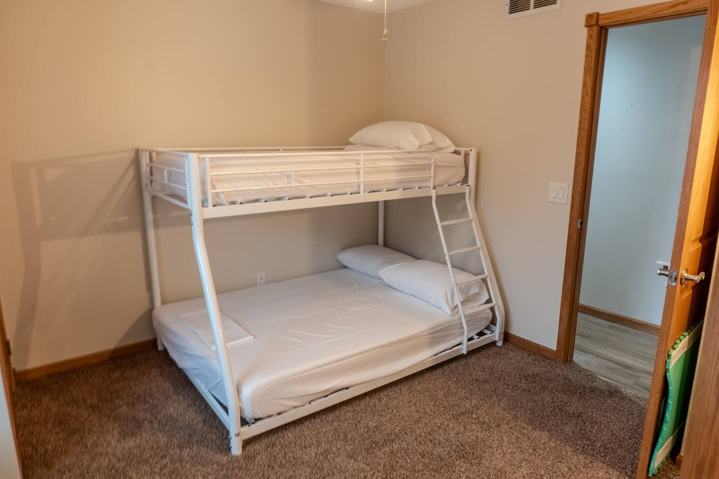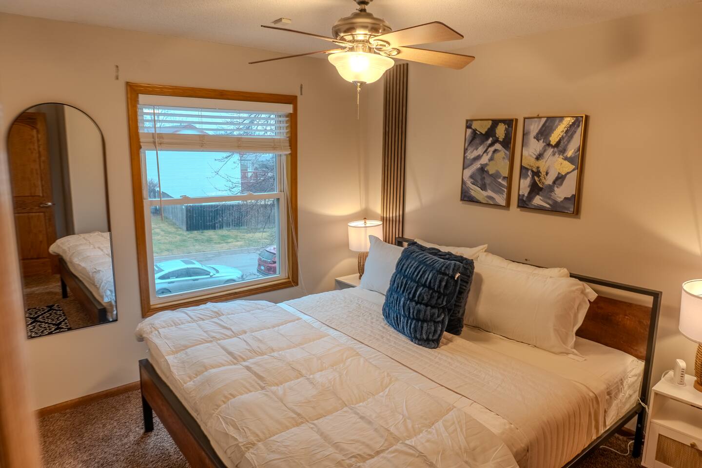 This spacious 4-bedroom, 3.5-bath home offers comfort and functionality with a beautiful view of Harrison Park right from the backyard. It’s ideal for families, business travelers, or groups who want space to relax in a quiet area while staying close to Wichita’s main roads and amenities. 🛏 Bedrooms Main Bedroom (upstairs) • King bed, sleeps 2 • En-suite full bathroom • Walk-in closet • Makeup station • Pack n Play Second Bedroom (upstairs) • King bed, sleeps 2 • Shared full bathroom nearby Third Bedroom (upstairs) • Bunk bed: Twin over full • Perfect for additional guests or children Fourth Bedroom (Basement) • Queen bed • Full bathroom 🛋 Living Spaces • Open main-floor living room with Smart TV • Dining area for 8 guests • Basement family room for games or relaxing 🍳 Kitchen • Fully stocked with cookware, utensils, and dinnerware • Coffee station: Keurig, kettle, and starter pods • Basic pantry items (oil, salt, pepper, etc.) • Dishwasher and full-size refrigerator 🎬 Basement • Downstairs movie room • Air Hockey Table • Laundry room with washer and dryer 🌿 Backyard & Deck • Deck with outdoor seating overlooking Harrison Park • Fully fenced yard with lawn space • Direct gate access to the park walking trail 🚗 Parking & Security • Driveway fits 2 vehicles, plus street parking for 1 • 2-car garage available • Ring doorbell camera for exterior security Please note that the street is moderately narrow — large trailers or oversized trucks are not recommended. Quiet residential area; parties or events are not permitted. This home provides all the essentials for a comfortable and convenient stay in east Wichita. Peaceful surroundings, direct park access, and easy connections to the city.