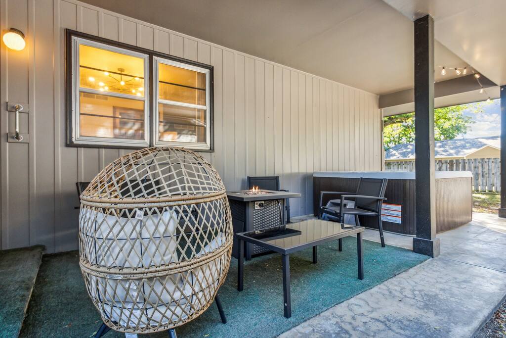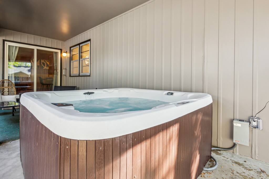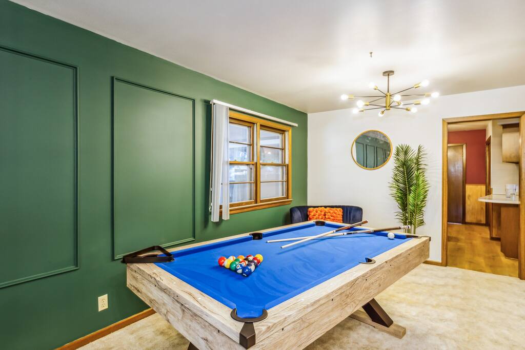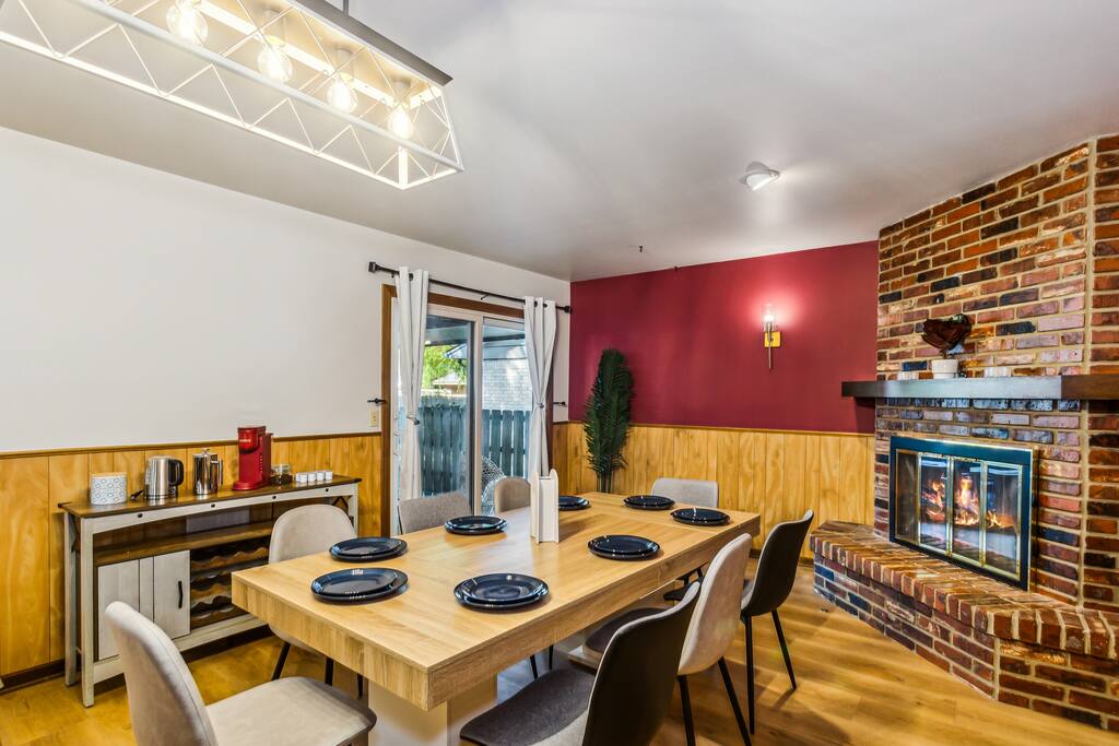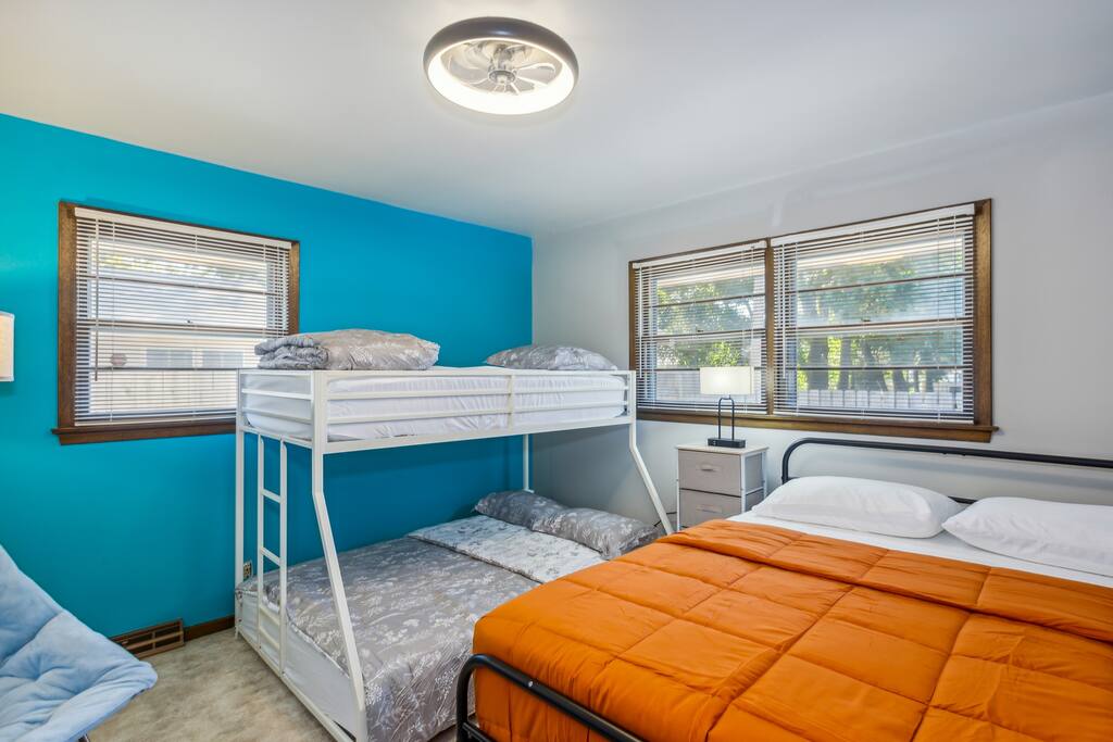 ★ Main Bedroom: Luxurious king-size bed for your relaxation. Accommodates two adults. A 43-inch TV equipped with streaming services. Full-body length mirror. Blackout blinds for a perfect sleep environment. ★ Second Bedroom: King-size bed that accommodates two adults. A 43-inch TV with full-motion mount for entertainment from any angle. ★ Third Bedroom: Cozy queen-size bed and bunk bed (full over twin). Perfect for families or a group of friends. ★ Living Room: Warmly designed for a cozy atmosphere. Features a 58-inch TV. Comfortable sectional sofa provides ample seating for relaxation and socializing. ★ Kitchen: Fully stocked with pans, cutlery, and knives for your culinary needs. Dedicated coffee station with a Keurig machine, hot water kettle, French press, and a selection of coffee and tea. Cooking essentials including oils, salt, and more. ★ On-site Laundry Facility: Washer and dryer with supplied laundry pods. ★ Backyard Oasis: Hot tub, fire pit, and relax seating environment. Text us for hot tub seasonal temperatures and availability. ★ Parking: Driveway parking for up to 4 vehicles ★ Dining Area: Elegant space for shared meals. Seating for 8. ★ Security Cameras: A Ring camera at the entrance is installed for your safety, the property, and the neighborhood. ★ Movie Theater Room: Equipped with home theater seats and bean bags for the ultimate viewing experience. Home theater sound system and a 70-inch TV screen for cinematic nights. Dedicated workspace for convenience and productivity.