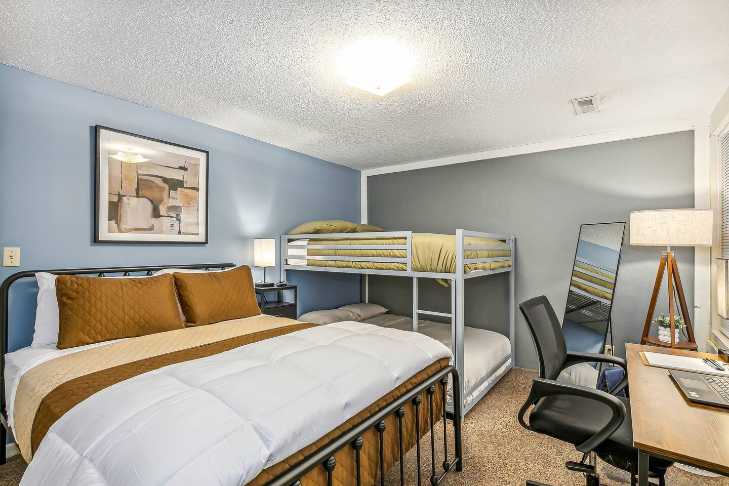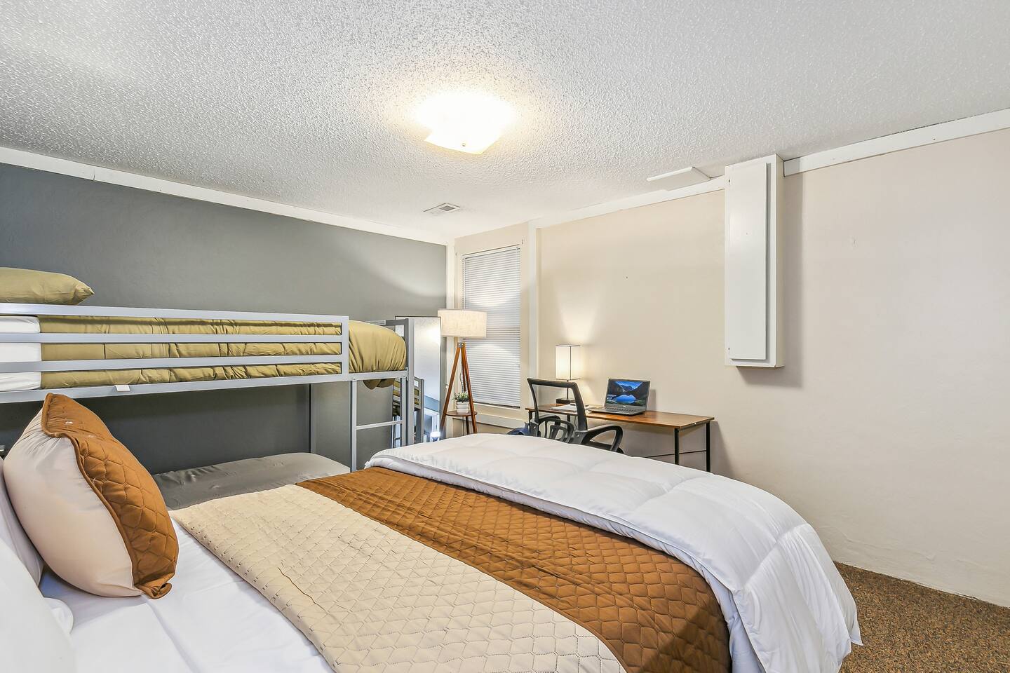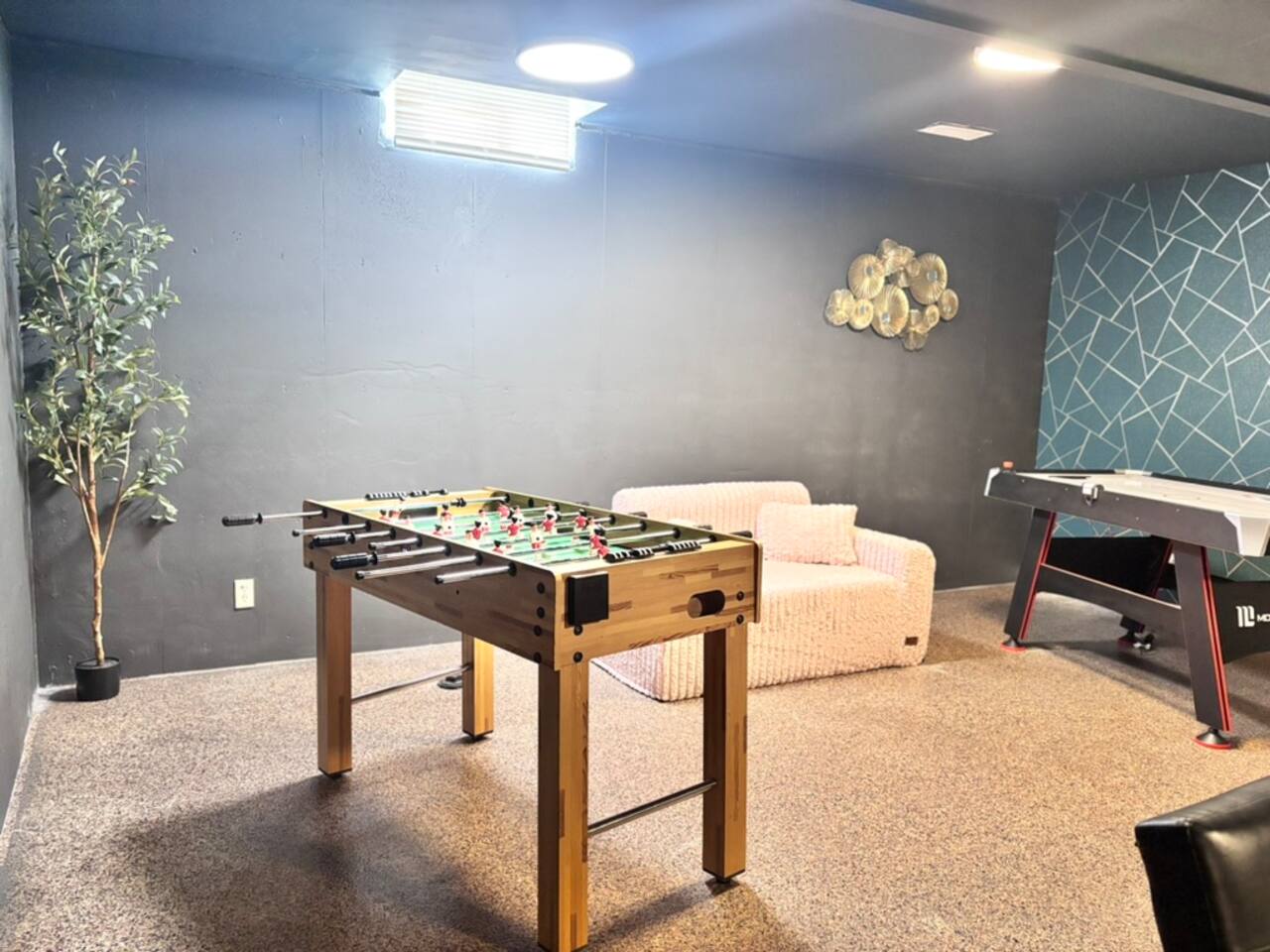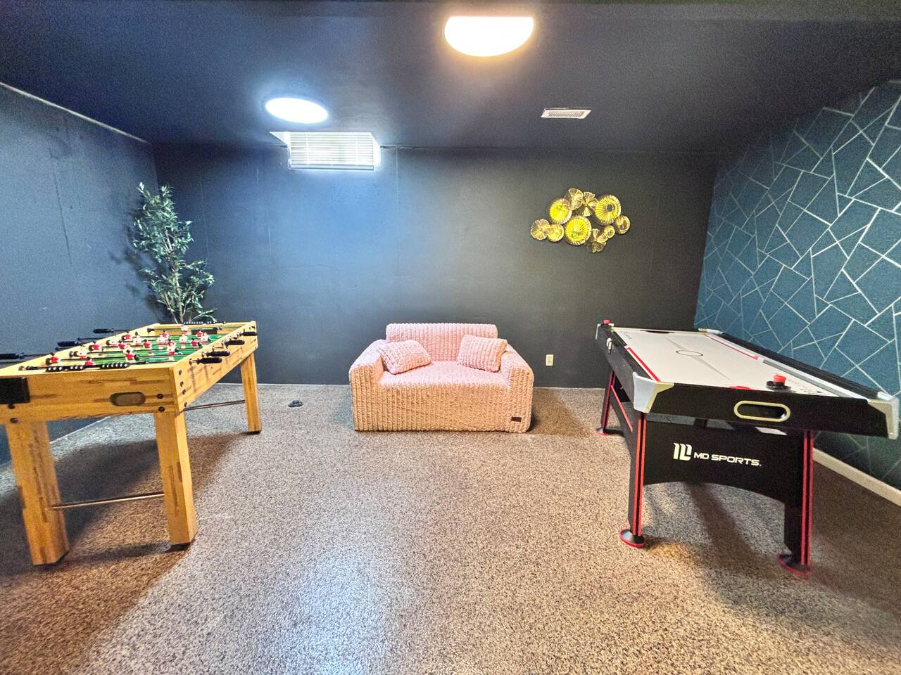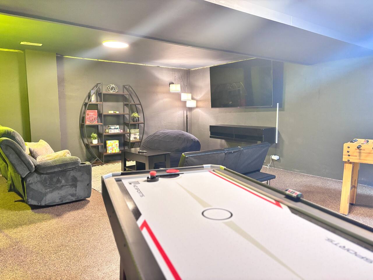 This home is perfect for families or groups, offering 3 bedrooms, entertainment areas, and a fully stocked kitchen. Relax indoors or enjoy the large backyard with a fire pit and grill. Remember this is one side of a duplex and completely private! 🛏 Bedrooms Main Bedroom • King bed, sleeps 2 • 40" Smart TV • Full-length mirror • Blackout blinds Second Bedroom • King bed • 40" TV with full-motion Third Bedroom • Queen bed + Full-over-Full bunk bed • Sleeps up to 4 • Desk and chair for workspace Movie Room • Foosball and air hockey table • 75" TV with theater seating 🛋 Living Spaces • Cozy living room with 50" TV • Dining area with seating for 8 💻 Workspace • Quiet spot with desk and fast Wi-Fi 🍳 Kitchen • Fully stocked with pans, cutlery, and knives • Coffee station: Keurig, kettle, French press, regular & decaf options • Basic cooking needs: oils, salt, etc 🌿 Backyard • Gazebo, fire pit, and grill • Playground for kids 🚗 Parking & Security • Driveway fits 4 cars • Ring camera at front door for security