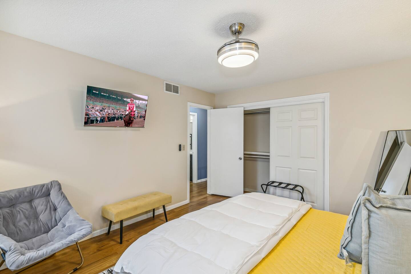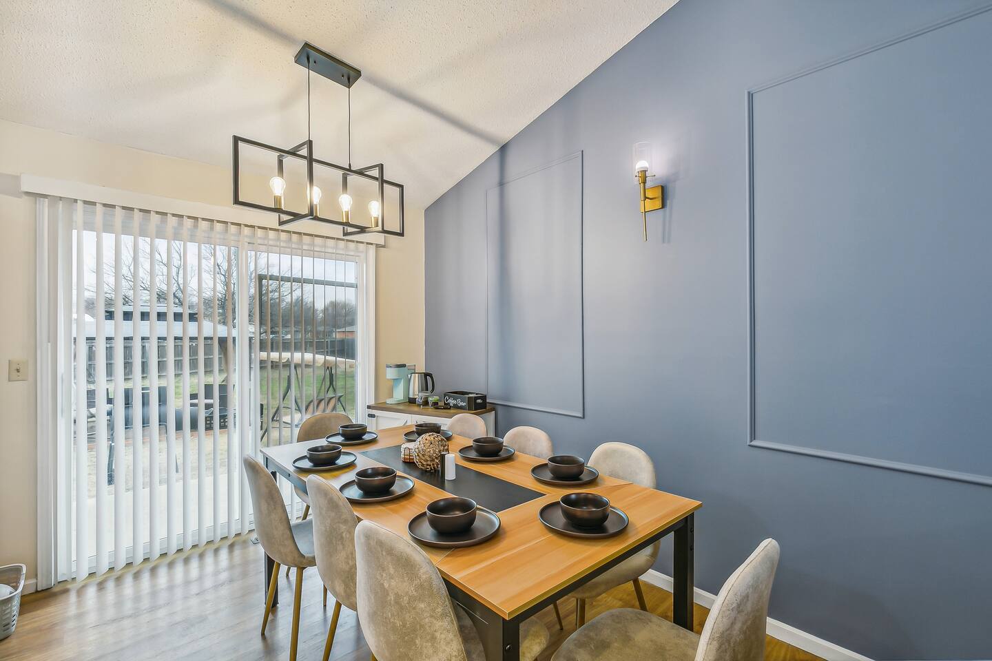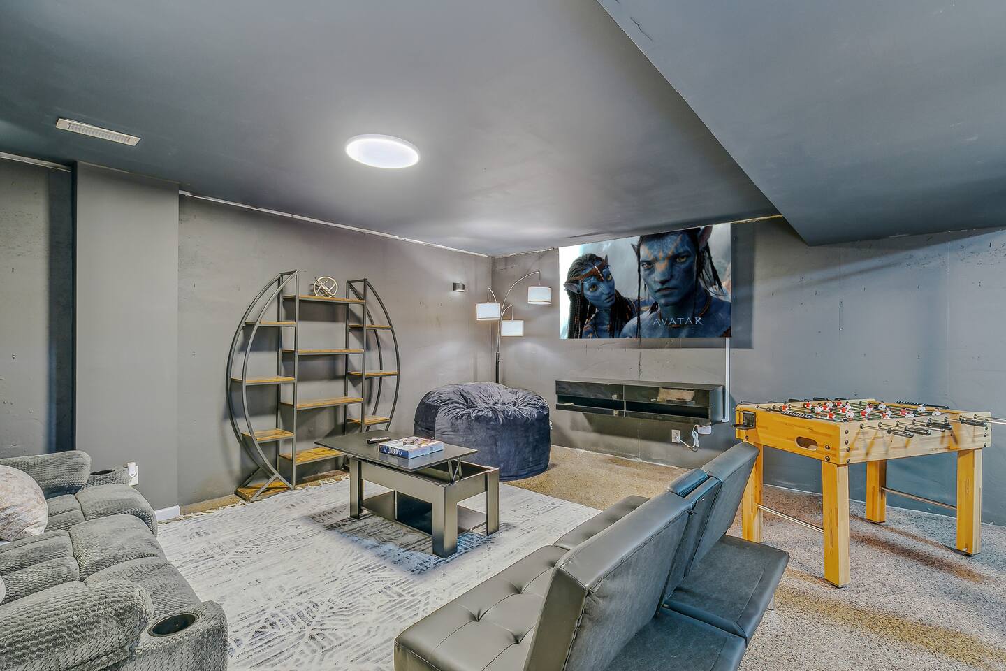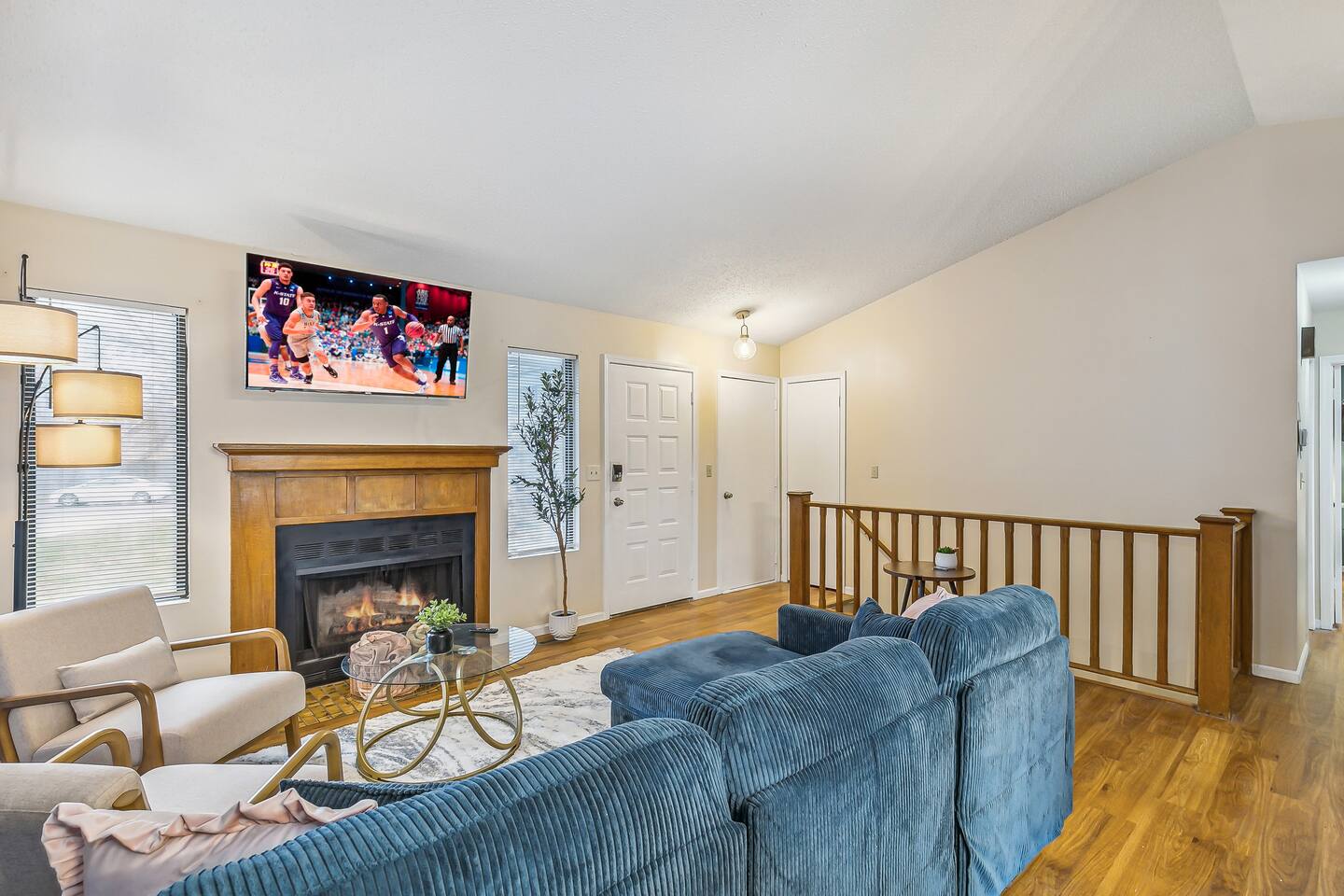 This home is perfect for families or groups, offering 3 bedrooms, entertainment areas, and a fully stocked kitchen. Relax indoors or enjoy the large backyard with a fire pit and grill. Remember this is one side of a duplex and completely private! 🛏 Bedrooms Main Bedroom • King bed, sleeps 2 • 40" Smart TV • Full-length mirror • Blackout blinds Second Bedroom • King bed • 40" TV with full-motion Third Bedroom • Queen bed + Full-over-Full bunk bed • Sleeps up to 4 • Desk and chair for workspace Movie Room • Foosball and air hockey table • 75" TV with theater seating 🛋 Living Spaces • Cozy living room with 50" TV • Dining area with seating for 8 💻 Workspace • Quiet spot with desk and fast Wi-Fi 🍳 Kitchen • Fully stocked with pans, cutlery, and knives • Coffee station: Keurig, kettle, French press, regular & decaf options • Basic cooking needs: oils, salt, etc 🌿 Backyard • Gazebo, fire pit, and grill • Playground for kids 🚗 Parking & Security • Driveway fits 4 cars • Ring camera at front door for security