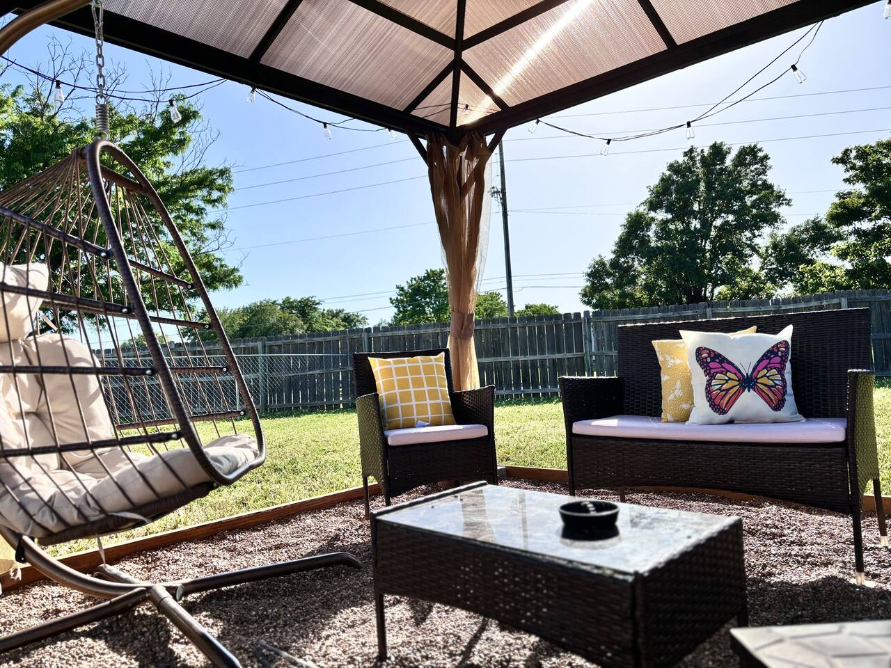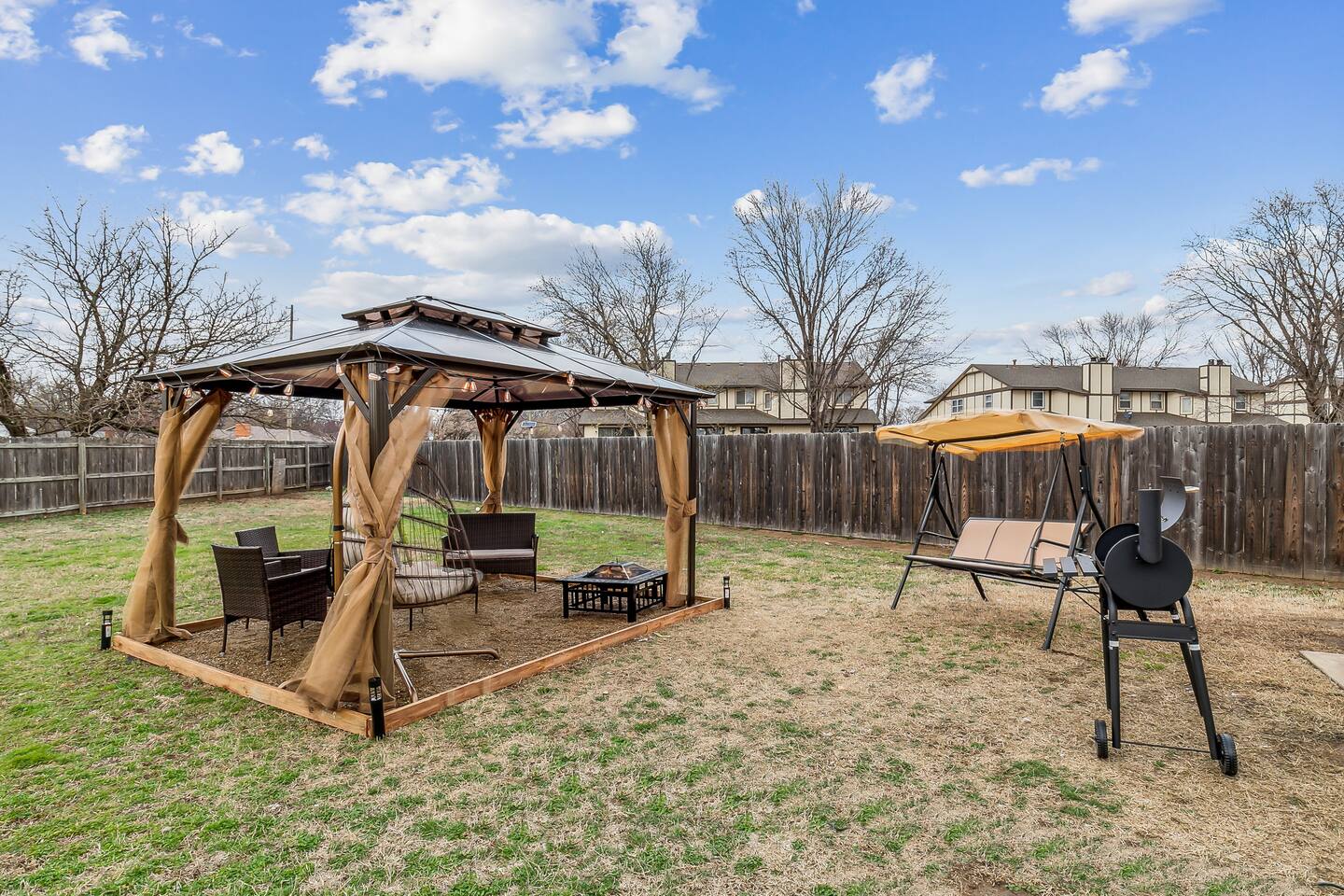 You’ll stay in a west Wichita neighborhood at near 13th St and Tyler Rd. Just 10 minutes from the airport and close to everything you need. Dillons grocery store and QuikTrip gas station are both less than 5 minutes away. This is a small house but fits up to 8 guests with 5 beds. Great for families or work groups. There’s a 75" TV, a backyard gazebo, and a kids’ playground. King beds, a stocked kitchen, and space to relax. Easy location with quick access to shops, food, and main roads.
