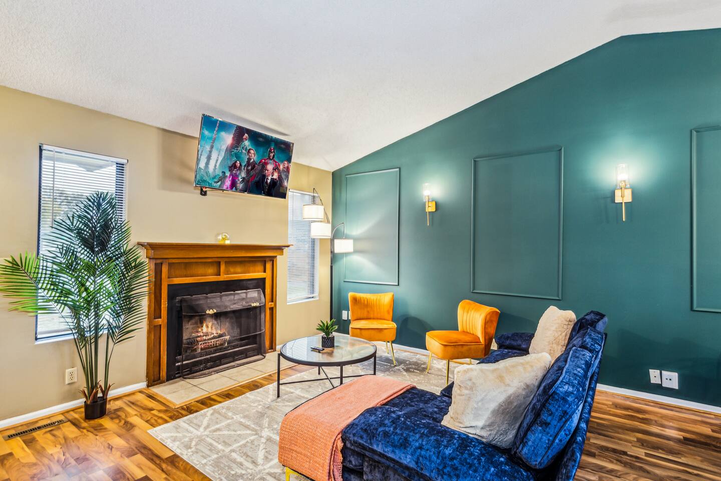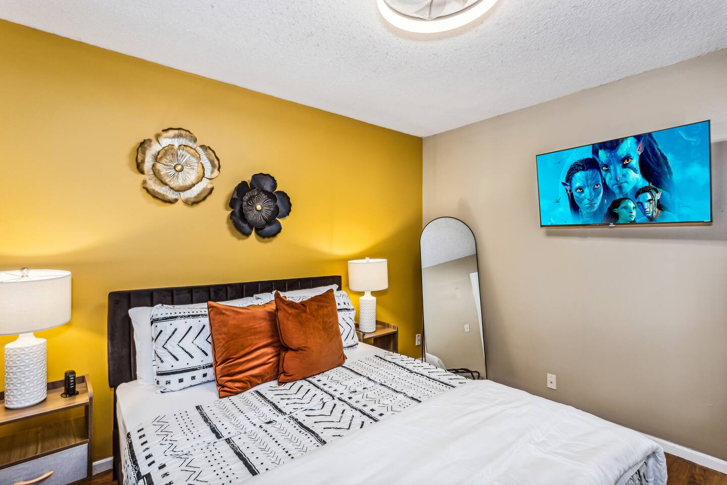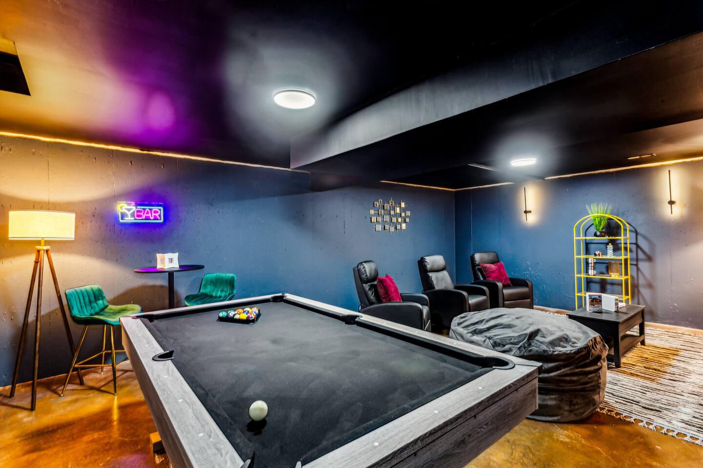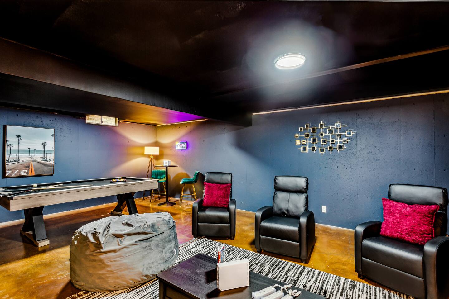 ✔ Main Bedroom: Luxurious king-size bed for optimum relaxation. Accommodates two adults. A 40-inch TV equipped with streaming services. Full-body length mirror. Blackout blinds for a perfect sleep environment. ✔ Second Bedroom: Queen-size bed. Accommodates two adults. Side-mounted 40-inch TV with full-motion mount for entertainment from any angle. ✔ Third Bedroom: Cozy queen-size bed and bunk bed (full over twin), accommodating up to five guests. Perfect for families or a group of friends. Dedicated workspace for convenience and productivity. ✔ Living Room: Warmly designed with terra cotta walls for a cozy atmosphere. Features a 55-inch TV for superior viewing experiences. Modern wall sconces add a touch of elegance and ambient lighting. Comfortable sectional sofa provides ample seating for relaxation and socializing. ✔ Dedicated Workspace: Serene spot with fast Wi-Fi. ✔ Kitchen: Fully stocked with pans, cutlery, and knives for your culinary needs. Dedicated coffee station with a Keurig machine, hot water kettle, French press, and a selection of coffee and tea. Cooking essentials including oils, salt, and more. Modern appliances to facilitate meal preparations. ✔ On-site Laundry Facility: Washer and dryer with supplied laundry pods for convenience. ✔ Parking: Driveway parking for four vehicles ✔ Dining Area: Elegant space for shared meals. Seating for 8. ✔ Security Cameras: A Ring camera at the entrance is installed for your safety, the property, and the neighborhood. ✔ Movie Theater Room: Equipped with home theater seats and bean bags for the ultimate viewing experience. Home theater and a 68-inch screen for cinematic nights. Pool table
