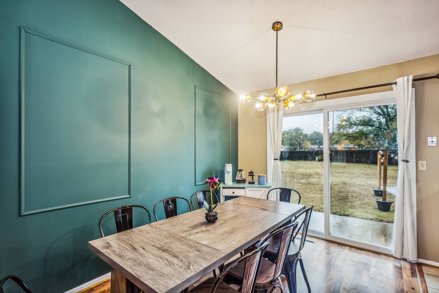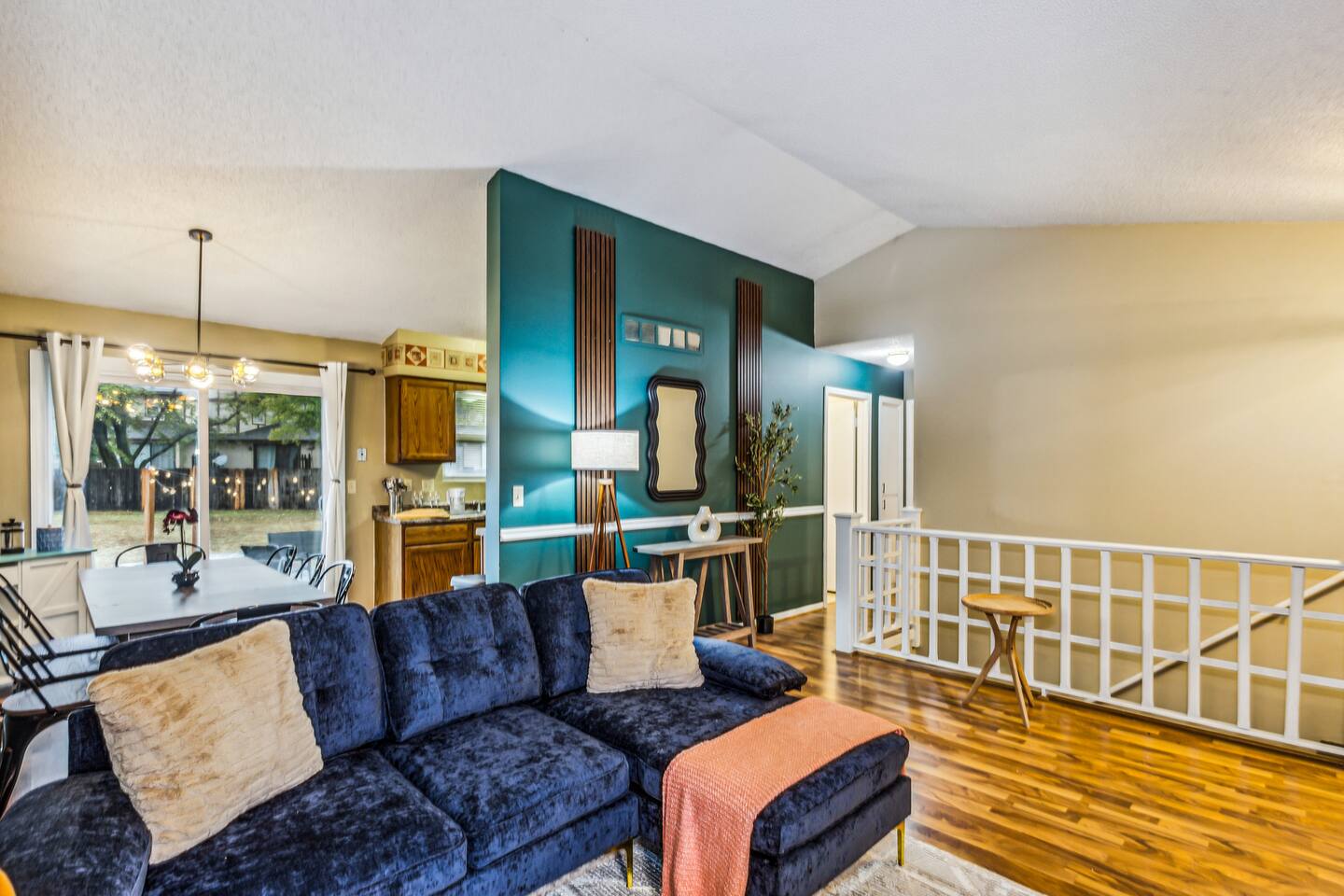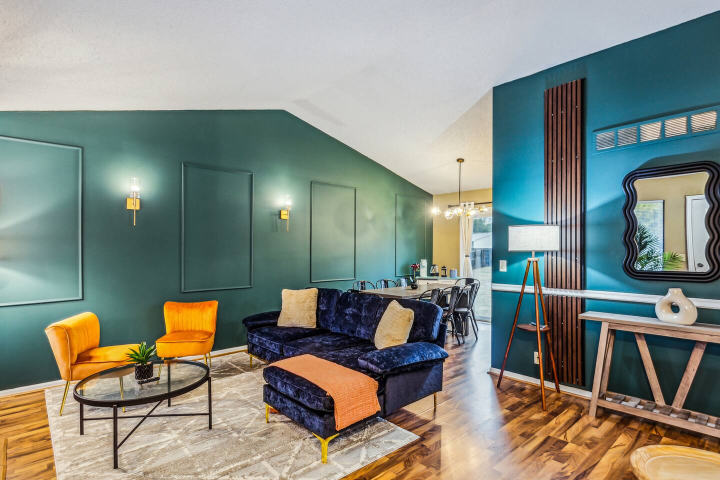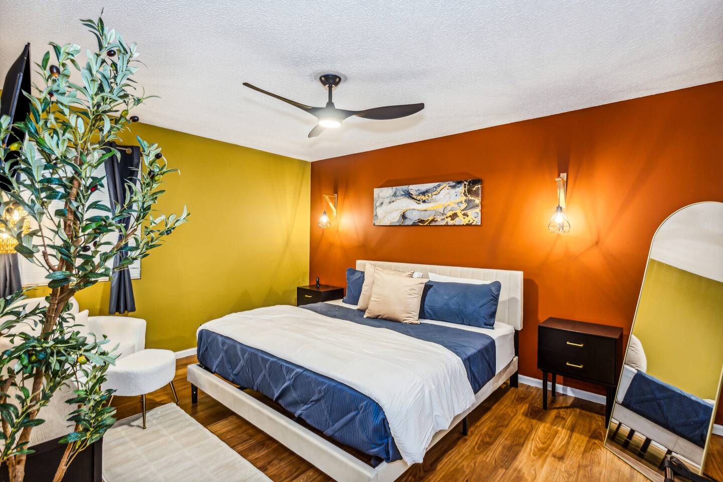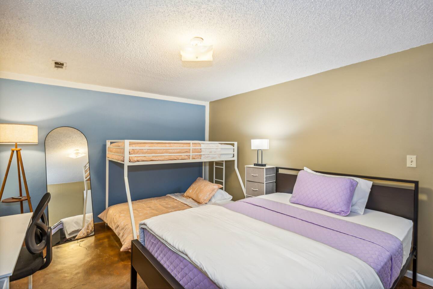 ✔ Main Bedroom: Luxurious king-size bed for optimum relaxation. Accommodates two adults. A 40-inch TV equipped with streaming services. Full-body length mirror. Blackout blinds for a perfect sleep environment. ✔ Second Bedroom: Queen-size bed. Accommodates two adults. Side-mounted 40-inch TV with full-motion mount for entertainment from any angle. ✔ Third Bedroom: Cozy queen-size bed and bunk bed (full over twin), accommodating up to five guests. Perfect for families or a group of friends. Dedicated workspace for convenience and productivity. ✔ Living Room: Warmly designed with terra cotta walls for a cozy atmosphere. Features a 55-inch TV for superior viewing experiences. Modern wall sconces add a touch of elegance and ambient lighting. Comfortable sectional sofa provides ample seating for relaxation and socializing. ✔ Dedicated Workspace: Serene spot with fast Wi-Fi. ✔ Kitchen: Fully stocked with pans, cutlery, and knives for your culinary needs. Dedicated coffee station with a Keurig machine, hot water kettle, French press, and a selection of coffee and tea. Cooking essentials including oils, salt, and more. Modern appliances to facilitate meal preparations. ✔ On-site Laundry Facility: Washer and dryer with supplied laundry pods for convenience. ✔ Parking: Driveway parking for four vehicles ✔ Dining Area: Elegant space for shared meals. Seating for 8. ✔ Security Cameras: A Ring camera at the entrance is installed for your safety, the property, and the neighborhood. ✔ Movie Theater Room: Equipped with home theater seats and bean bags for the ultimate viewing experience. Home theater and a 68-inch screen for cinematic nights. Pool table