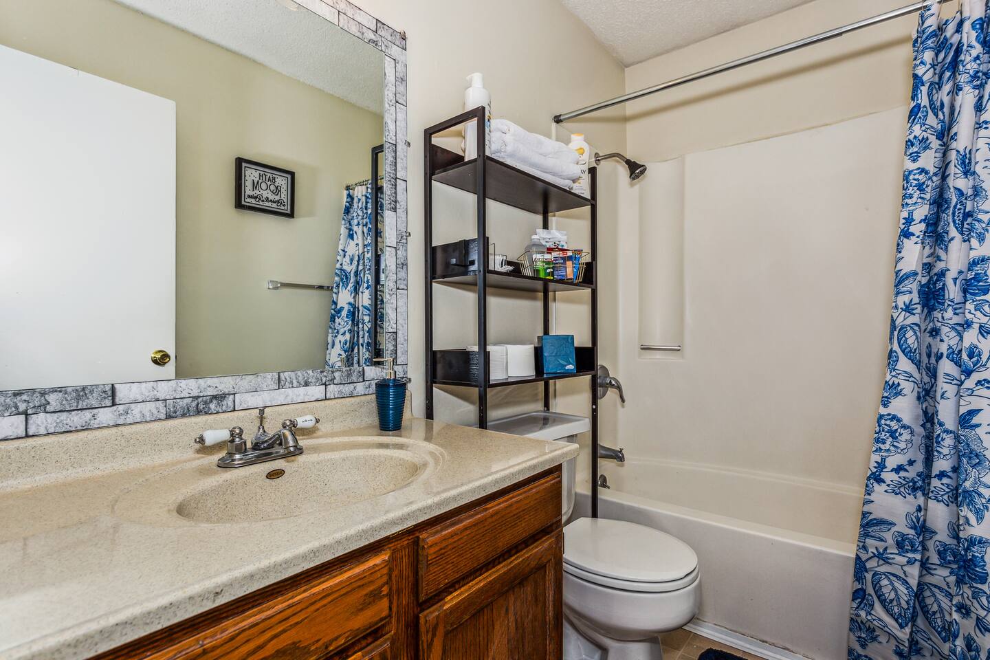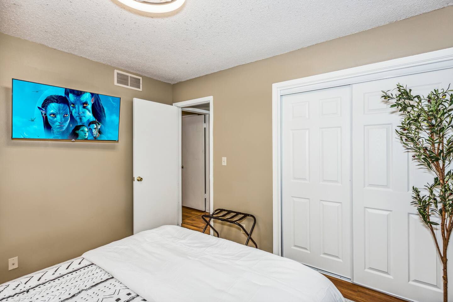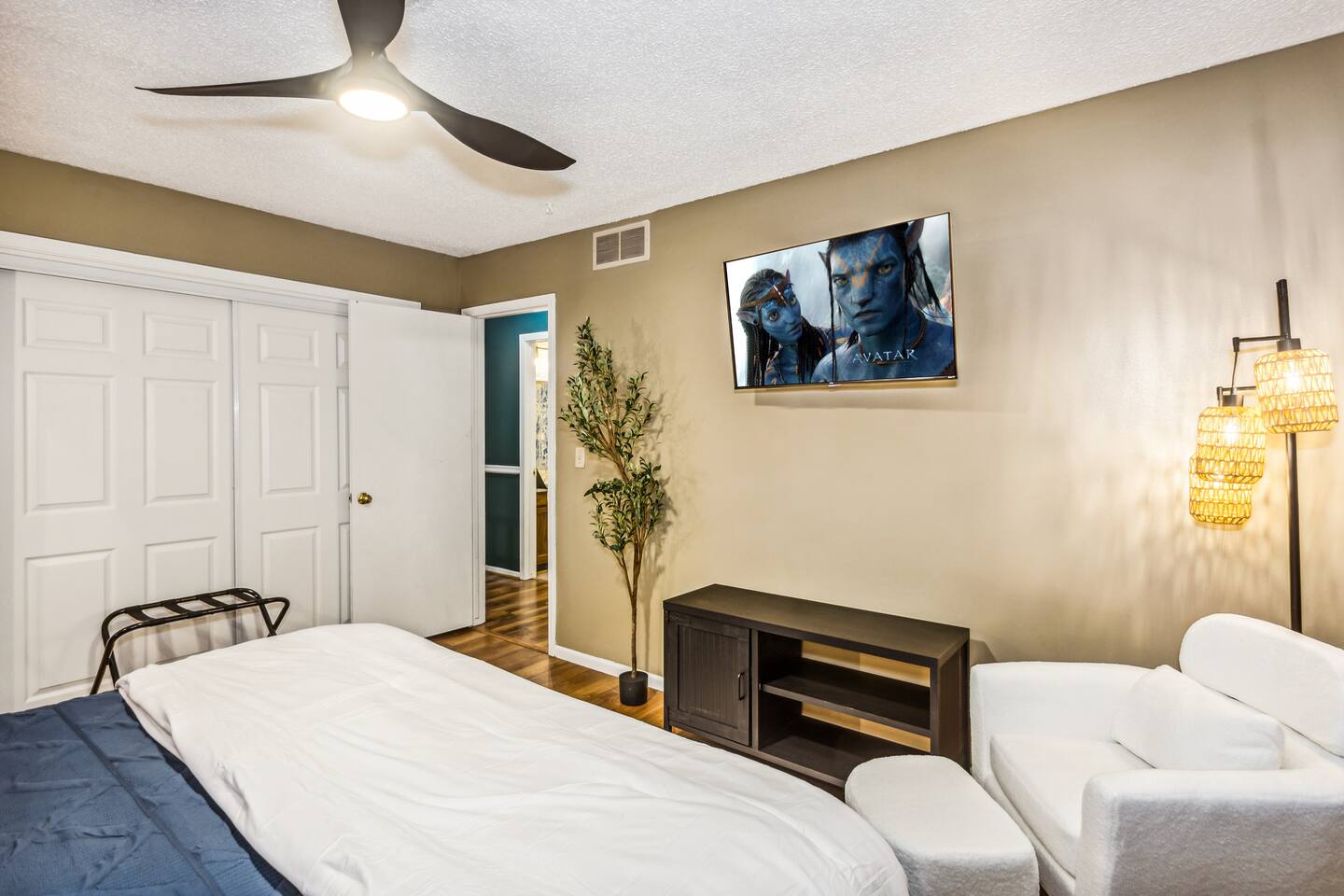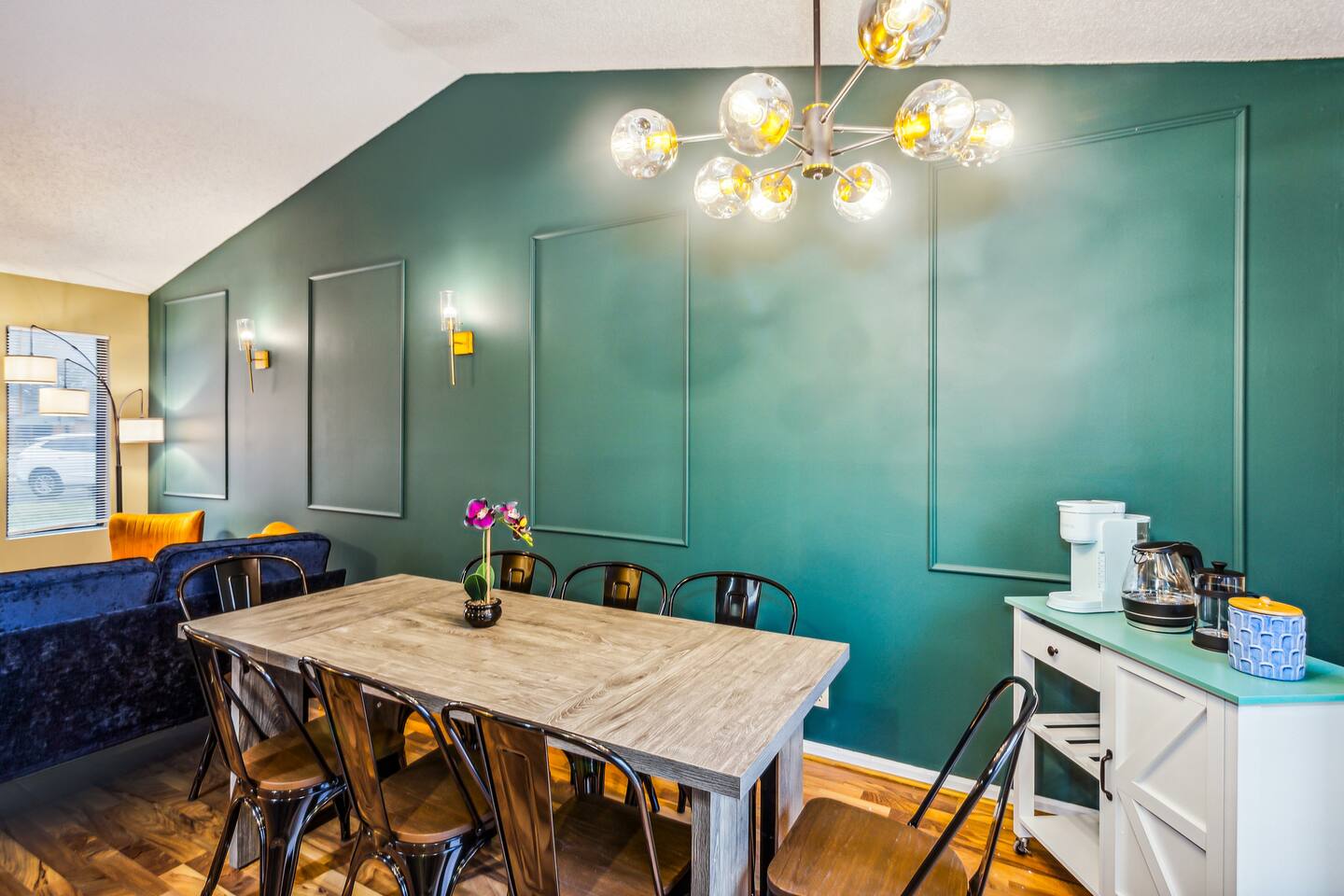 ✔ Main Bedroom: Luxurious king-size bed for optimum relaxation. Accommodates two adults. A 40-inch TV equipped with streaming services. Full-body length mirror. Blackout blinds for a perfect sleep environment. ✔ Second Bedroom: Queen-size bed. Accommodates two adults. Side-mounted 40-inch TV with full-motion mount for entertainment from any angle. ✔ Third Bedroom: Cozy queen-size bed and bunk bed (full over twin), accommodating up to five guests. Perfect for families or a group of friends. Dedicated workspace for convenience and productivity. ✔ Living Room: Warmly designed with terra cotta walls for a cozy atmosphere. Features a 55-inch TV for superior viewing experiences. Modern wall sconces add a touch of elegance and ambient lighting. Comfortable sectional sofa provides ample seating for relaxation and socializing. ✔ Dedicated Workspace: Serene spot with fast Wi-Fi. ✔ Kitchen: Fully stocked with pans, cutlery, and knives for your culinary needs. Dedicated coffee station with a Keurig machine, hot water kettle, French press, and a selection of coffee and tea. Cooking essentials including oils, salt, and more. Modern appliances to facilitate meal preparations. ✔ On-site Laundry Facility: Washer and dryer with supplied laundry pods for convenience. ✔ Parking: Driveway parking for four vehicles ✔ Dining Area: Elegant space for shared meals. Seating for 8. ✔ Security Cameras: A Ring camera at the entrance is installed for your safety, the property, and the neighborhood. ✔ Movie Theater Room: Equipped with home theater seats and bean bags for the ultimate viewing experience. Home theater and a 68-inch screen for cinematic nights. Pool table
