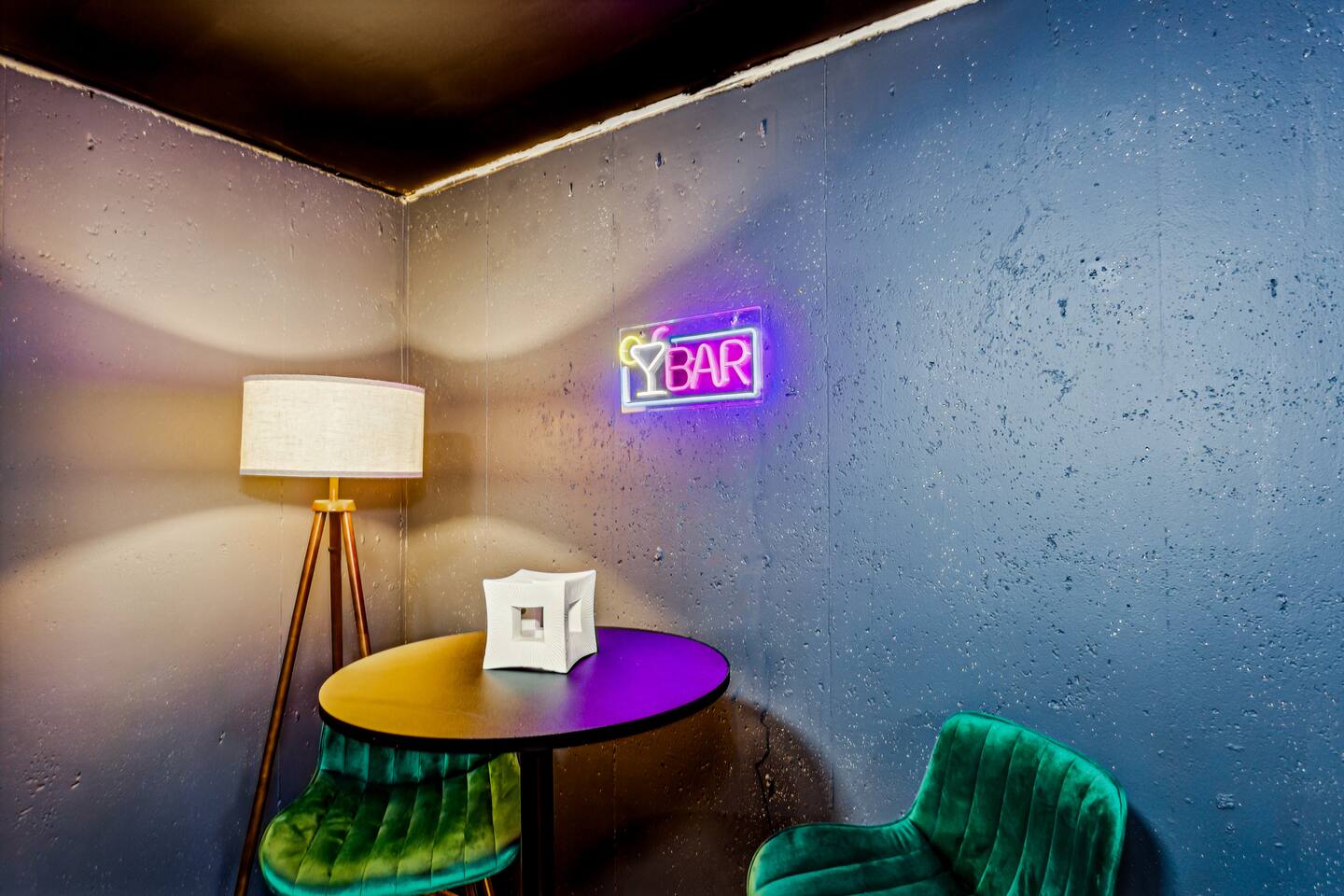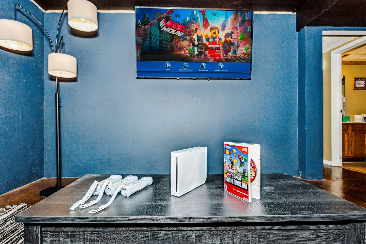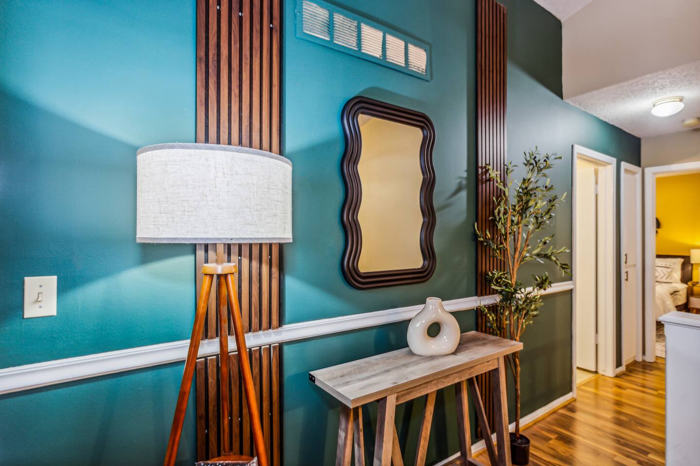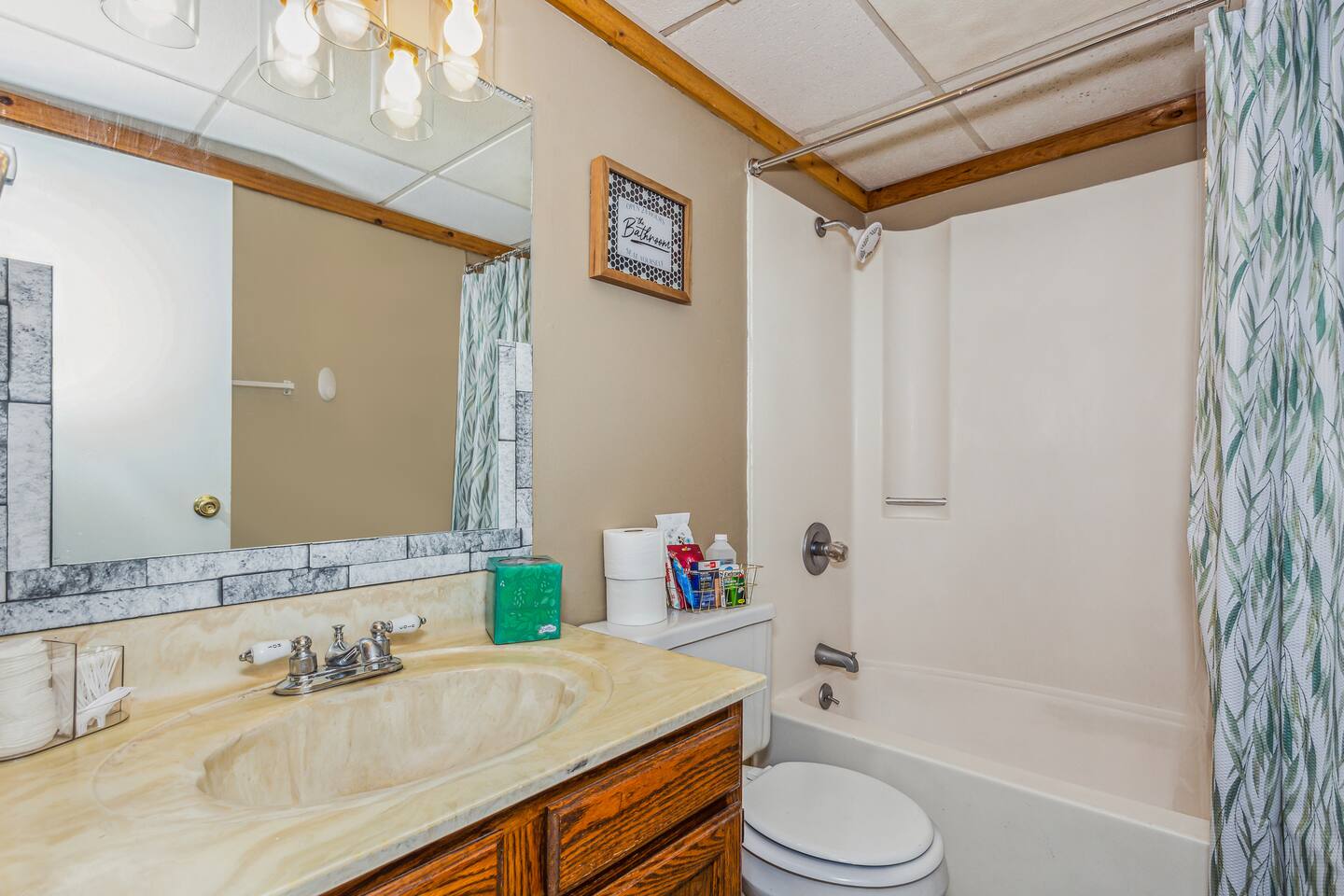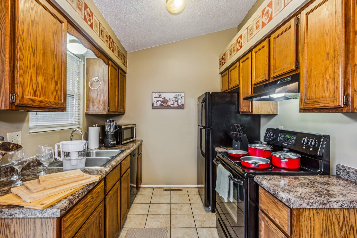 ✔ Main Bedroom: Luxurious king-size bed for optimum relaxation. Accommodates two adults. A 40-inch TV equipped with streaming services. Full-body length mirror. Blackout blinds for a perfect sleep environment. ✔ Second Bedroom: Queen-size bed. Accommodates two adults. Side-mounted 40-inch TV with full-motion mount for entertainment from any angle. ✔ Third Bedroom: Cozy queen-size bed and bunk bed (full over twin), accommodating up to five guests. Perfect for families or a group of friends. Dedicated workspace for convenience and productivity. ✔ Living Room: Warmly designed with terra cotta walls for a cozy atmosphere. Features a 55-inch TV for superior viewing experiences. Modern wall sconces add a touch of elegance and ambient lighting. Comfortable sectional sofa provides ample seating for relaxation and socializing. ✔ Dedicated Workspace: Serene spot with fast Wi-Fi. ✔ Kitchen: Fully stocked with pans, cutlery, and knives for your culinary needs. Dedicated coffee station with a Keurig machine, hot water kettle, French press, and a selection of coffee and tea. Cooking essentials including oils, salt, and more. Modern appliances to facilitate meal preparations. ✔ On-site Laundry Facility: Washer and dryer with supplied laundry pods for convenience. ✔ Parking: Driveway parking for four vehicles ✔ Dining Area: Elegant space for shared meals. Seating for 8. ✔ Security Cameras: A Ring camera at the entrance is installed for your safety, the property, and the neighborhood. ✔ Movie Theater Room: Equipped with home theater seats and bean bags for the ultimate viewing experience. Home theater and a 68-inch screen for cinematic nights. Pool table