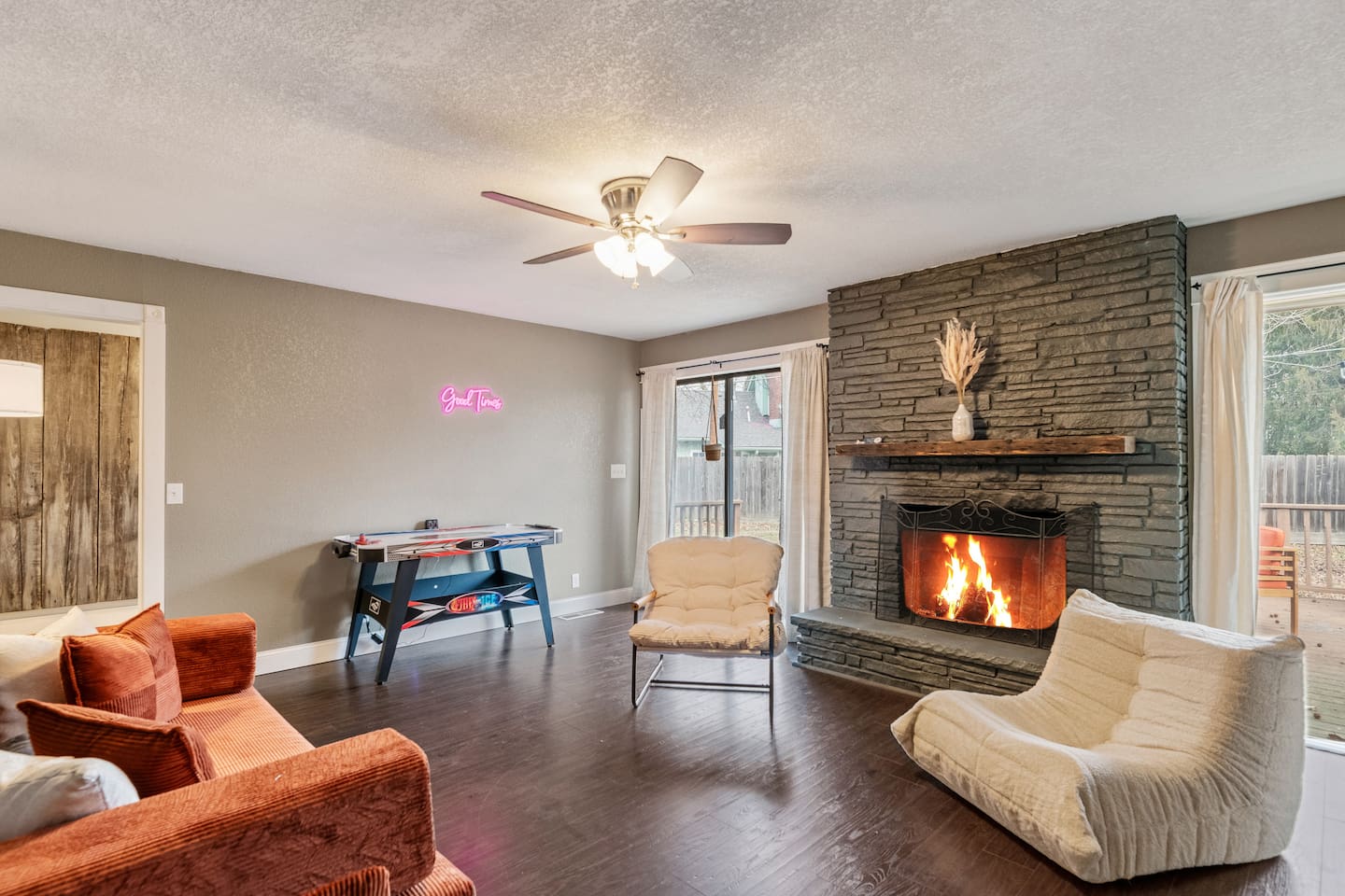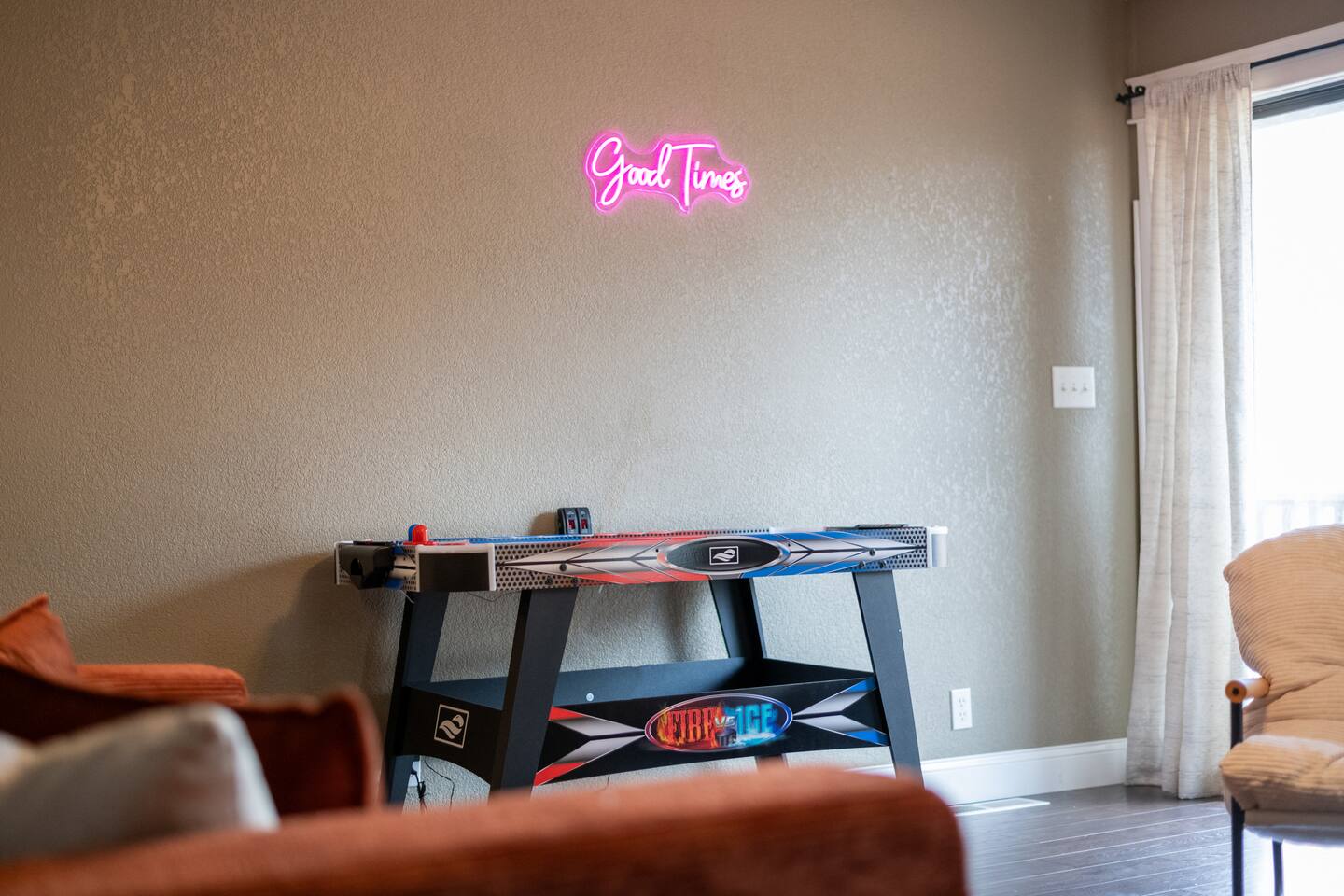 This comfortable ranch style home offers 4 beds (2 kings) and two full bathrooms for plenty of space to relax and feel at home. You can enjoy having everything on one level with no stairs. You will be staying in a central east Wichita location, close to shops, gas stations, and the city’s main activities, while still enjoying a quiet place to rest. It is a great option for families, work trips, or anyone wanting a simple and comfortable stay. This house is 1660 sq ft Bedrooms Main Bedroom • King size bed, sleeps 2 • 43 inch Roku TV • Full body length mirror • Blackout blinds for a comfortable sleep environment Second Bedroom • King size bed, sleeps 2 • 40 inch TV with full motion mount Third Bedroom • Cozy queen size bed and full bed • Suitable for families or groups Living Room • Warm and comfortable design • 50 inch TV • Spacious sectional sofa for relaxing and socializing Kitchen • Fully stocked with pans, cutlery, and knives • Coffee station with Keurig, hot water kettle, French press, and coffee and tea • Cooking essentials including oils and salt Game Room • Comfortable seating and relaxed environment • Air hockey table • 55 inch TV screen Backyard • Private deck with outdoor seating • Fully fenced for privacy Dining Area • Comfortable space for shared meals • Seating for 8 guests Parking • Driveway parking for two vehicles Security • Ring camera at the entrance for the safety of guests, property, and neighborhood This home provides all the essentials for a comfortable and convenient stay in a central Wichita location. This home is located in a quiet residential neighborhood with nearby neighbors. We ask that parking be kept in the driveway or garage. Large trailers or oversized vehicles may be difficult to accommodate. This is a peaceful area, so gatherings or events are not permitted. You will enjoy a calm and friendly neighborhood while still being close to shops, main roads, and all that east Wichita has to offer.